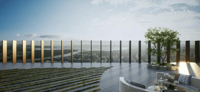 垂直绿化设计,营造花园式办公场域,生态景观始于约14816m²河套合作区中心公园,连接商业裙楼屋顶花园,优雅延伸至办公塔楼
