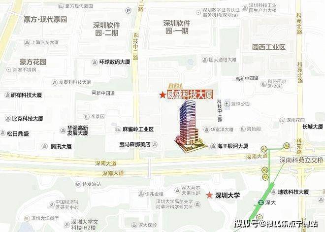 大厦属甲A级别写字楼,位于南山科技园,总层数为30层,位于深南大道西侧,深大北门正对面,地铁口(罗宝线深大站A3)物业,毗邻深大三大主干道:南海大道、科苑大道以及深南大道。