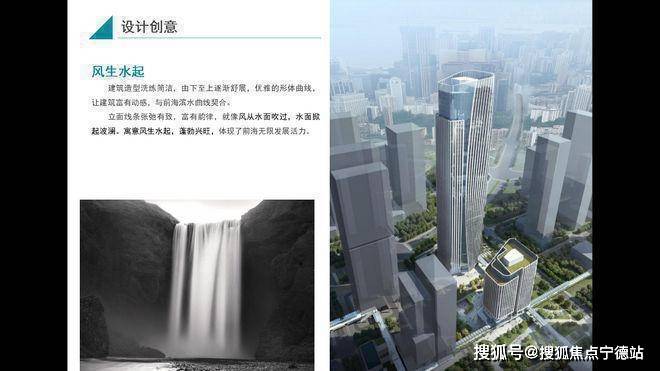 立面线条张弛有致,富有韵律,就像风从水面吹过,水面掀起波澜。寓意风生水起,蓬勃兴旺,体现了前海无限发展活力。