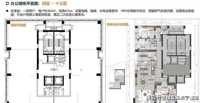 大平层公寓式设计,每层配备有厨房通风、卫生间给排水、燃气等加装条件,可商办,可居住,可会所接待等多种使用场景功能随心设计