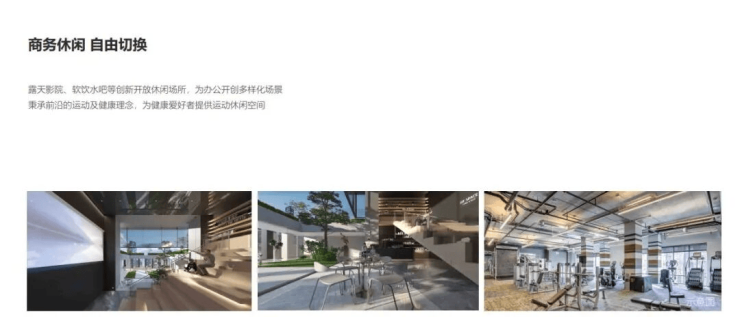 露天影院、软饮水吧等创新开放休闲场所,为办公开创多样化场景 秉承前沿的运动及健康理念,为健康爱好者提供运动休闲空间!