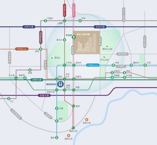 无缝接驳地铁10号线冬瓜岭站,纵享福田“一中枢、双口岸、四核心”枢纽体系,再造引桥匝道升级微循交通体系,高效互联湾区城市与全球资本。