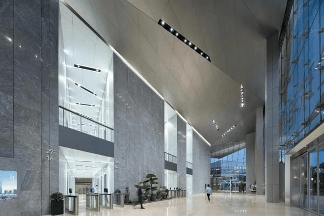 双大堂设计,定义国际商务形象;空中奢华空间,彰显高端王者气度。首层大堂挑高15.5米,30-31层空中大堂观景极佳,中庭公共空间人文互动。