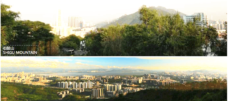 其中,洞尾山与石鼓山公园为直接视野可见景观,塘朗山公园、社区公园、西丽水库、城市绿轴由于外部或内部楼体遮挡,为局部高层可见景观。