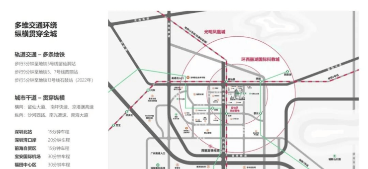 另有南光高速和粤港澳高速相邻,从交通上提升留仙洞总部基地于深圳与粤港澳大湾区的战略地位。