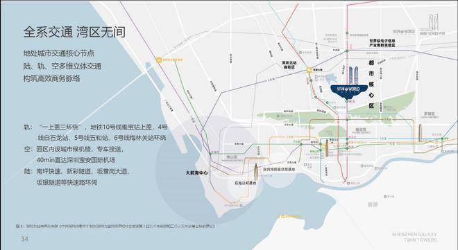 5、全系交通网络:10号线雅宝上盖,3站直达福田中心区;园区内设城市候机楼,专车接送宝安机场;南坪快速、新彩隧道、坂雪岗大道、坂银通道等快速路环伺。
