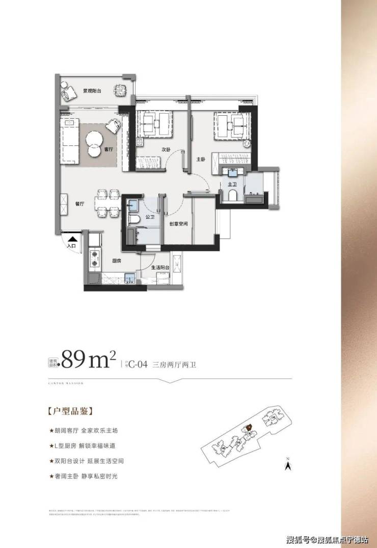 ①、出售面积:86平米3房2卫2厅,总价392万起