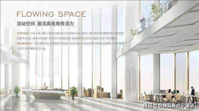 灵动标准层:中英人寿大厦,以国际标准打造,标准层高4.5米,净高≥3米,室内空间通透实用,采用无角柱的空间设计,奢享开阔视野,单元内柱间距超10米,使用率达70%之高,满足企业灵活布局需求。
