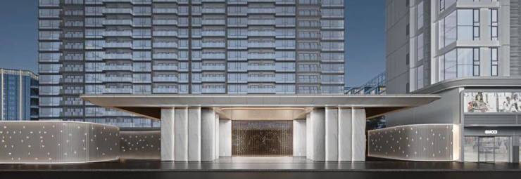 鎏光门庭入户大堂,采用豪宅海派手法设计,参考亚洲瑰丽酒店风格,打造“一步一景 一堂三景”五星级酒店式归家礼遇;材质上采用定制双色石材、巴西铂金钻奢石,并植入百年非遗西关手打铜工艺,彰显高级质感与格调。