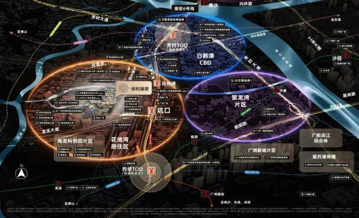 ◎ 花地湾居住区:大力推动产业科技互促双强,聚焦“广佛极点”科创中心功能定位。板块同步开发建设生活大城,承接产、商人群居住需求。