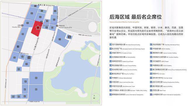 项目位于“后海金融总部基地”,规划为深圳超级总部聚集区、全市第三金融商务区和国际物流总部中心。区域内聚集华润、阿里、联想、腾讯、字节跳动等行业塔尖企业,形成国内领先的行业金字塔商务群。
