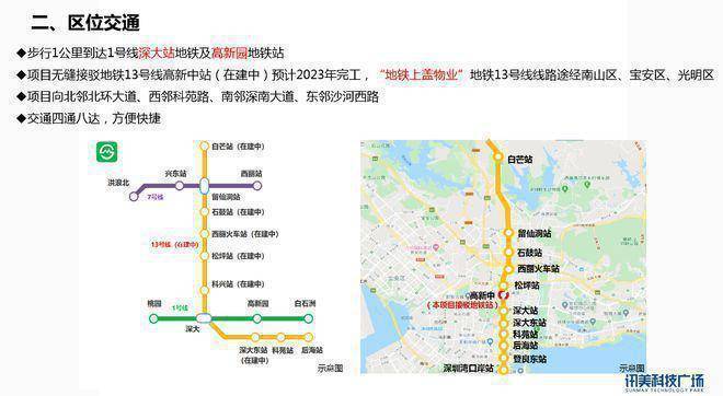 地铁站:1号线深大站A出口、13号线科兴站上盖物业;