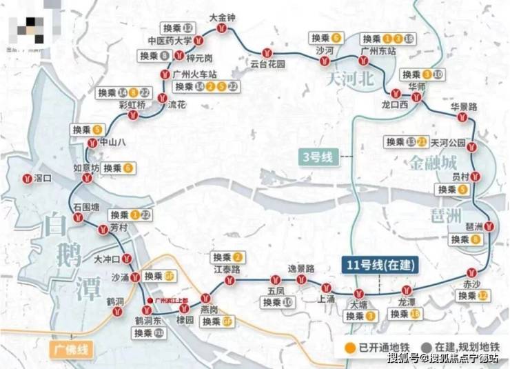 广州11号线以及佛山11号线鹤洞东站双地铁上盖,3横2纵大路网+公交站场+水上巴士,集水、陆、轨等多维交通方式于一体,半小时城央生活圈,1小时湾区生活圈。 11号线共设32个站点,全长44.2km,途径天河、白云、越秀、荔湾和海珠等5个含金量极高的区域,并连接广州火车站、广州东站等交通枢纽。
