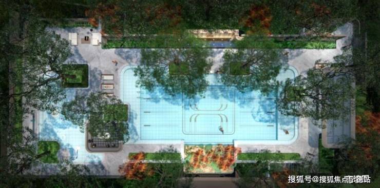 花园泳池:成人、儿童分池玩乐,安心释放玩水天性(成人泳池面积约400㎡,泳道长约30m,儿童泳池面积约120㎡)