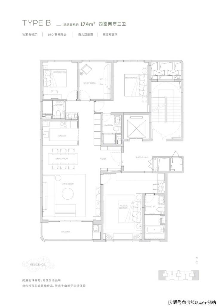 ②、出售面积:174平米4房3卫2厅,总价999万起