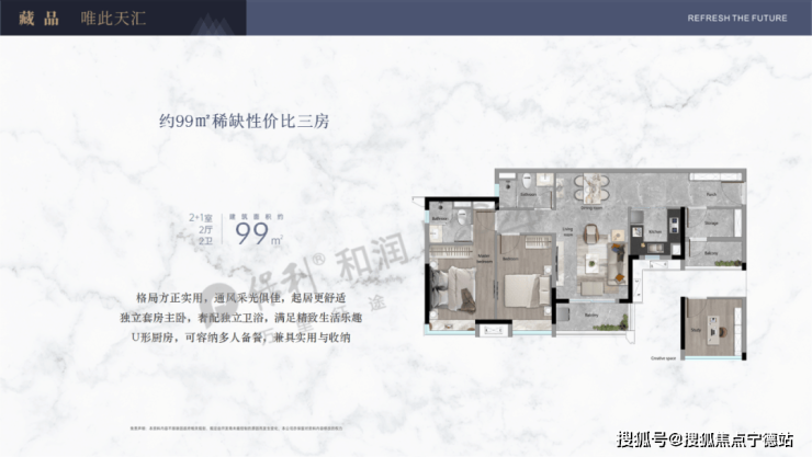 ①、出售面积:99平米3房2卫2厅,总价418万起