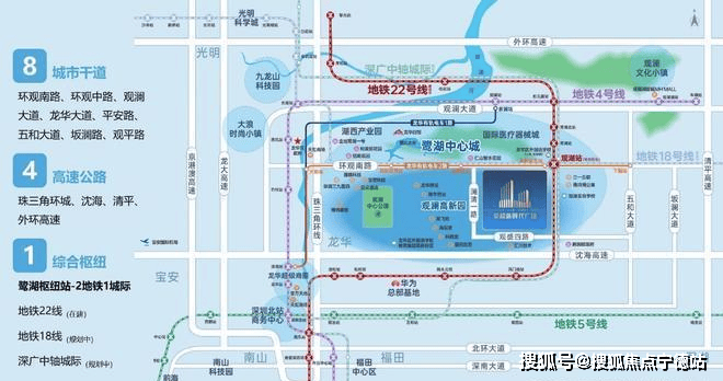 龙华产核——鹭湖中心城地处龙华万亿级数字经济圈、梅观创新走廊的交汇中心,亦是龙华六大重点片区的核心枢纽