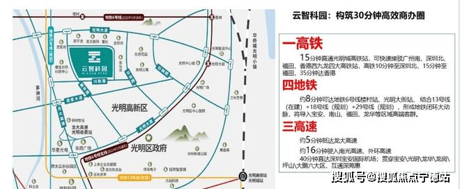 15分钟直通光明城高铁站,可快速接驳广州南、深圳北、福田、香港西九龙四大高铁站,高铁10分钟至深圳北,15分钟至福田,35分钟达香港