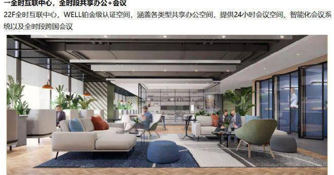 22F全时互联中心,WELL铂金级认证空间,涵盖各类型共享办公空间,提供24小时会议空间、智能化会议系统及全时段跨国会议;