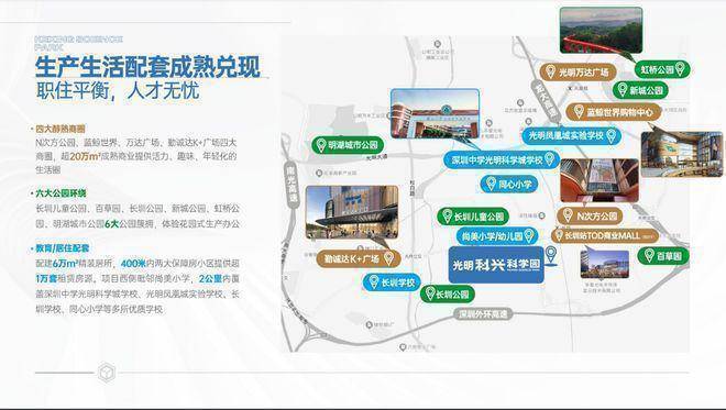 ③、【教育/居住配套】:配建6万㎡精装居所,400米内两大保障房小区提供超1万套租赁房源。项目西侧毗邻尚美小学,2公里内覆盖深圳中学光明科学城学校、光明凤凰城实验学校、长圳学校、同心小学等多所优质学校。
